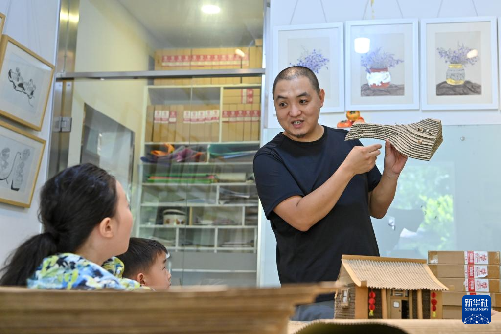 在位于山西省太原市万柏林区的工作室内,王帅栋向女儿传授瓦楞纸裁剪技巧(8月4日摄)。