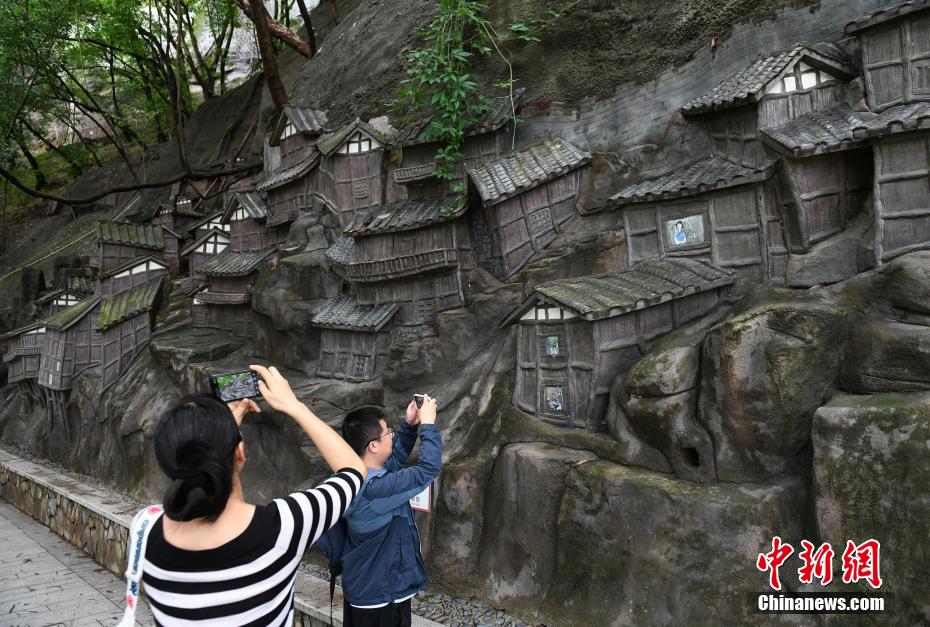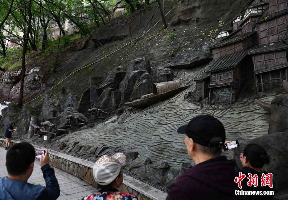 图为重庆临崖峭壁上的巨型艺术浮雕吸引市民驻足拍照。