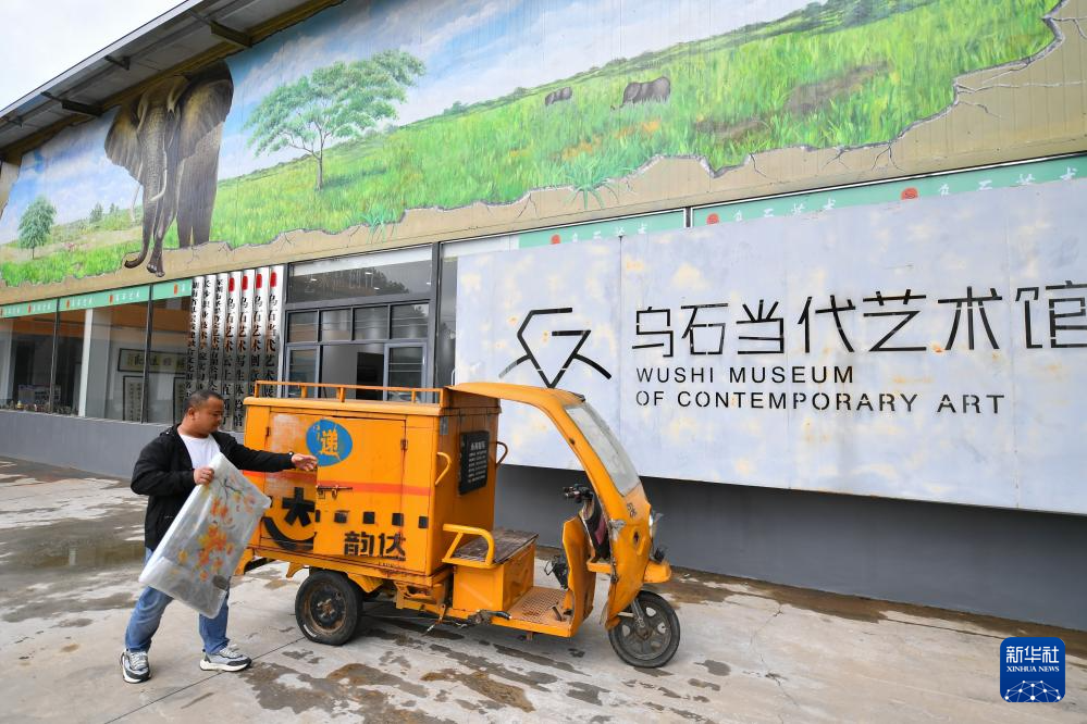 11月8日,在湖南省浏阳市小河乡乌石村的乌石当代艺术馆,快递员准备将油画放置到快递车上。