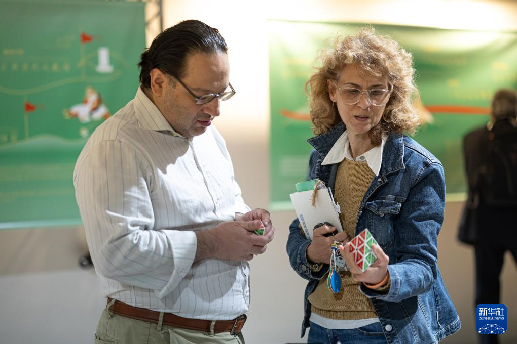 5月24日,在意大利罗马,参观者在“汉字中的文明密码”展览上体验甲骨文主题魔方。