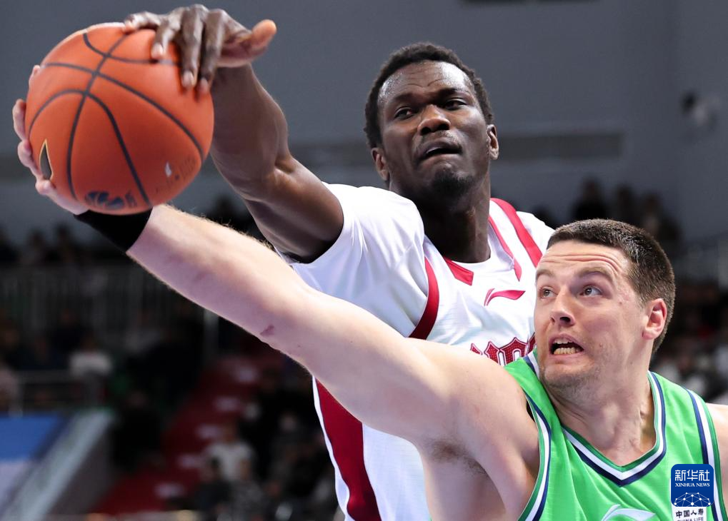 12月21日,山西汾酒队球员迪亚洛(左)在比赛中突破天津先行者队球员郑昊燃的防守。