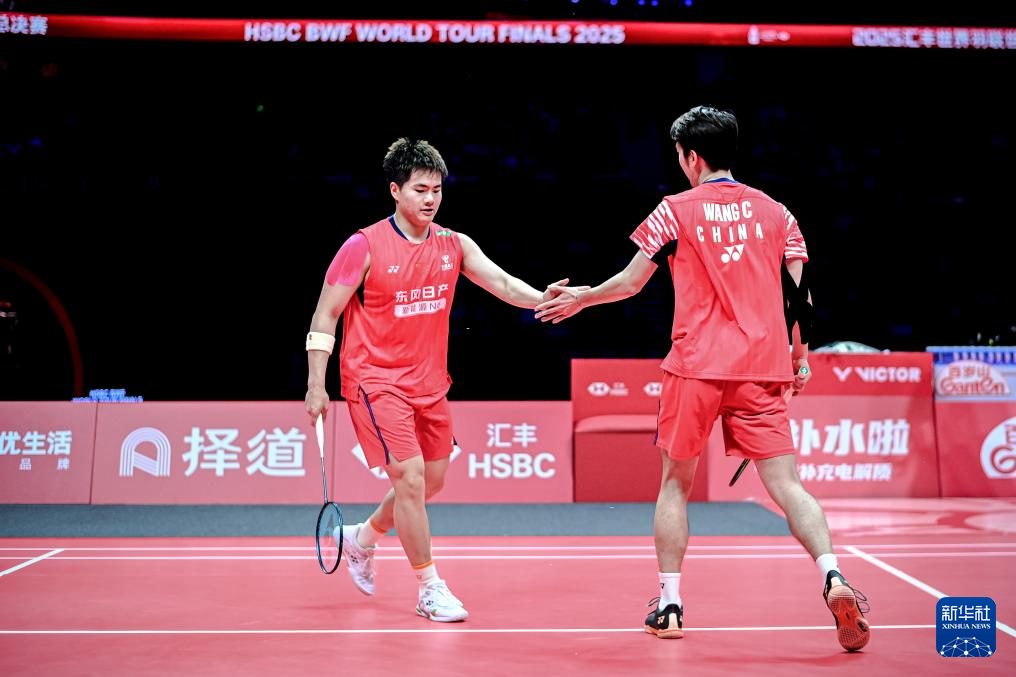 12月21日,中国组合梁伟铿(左)/王昶在决赛中庆祝得分。