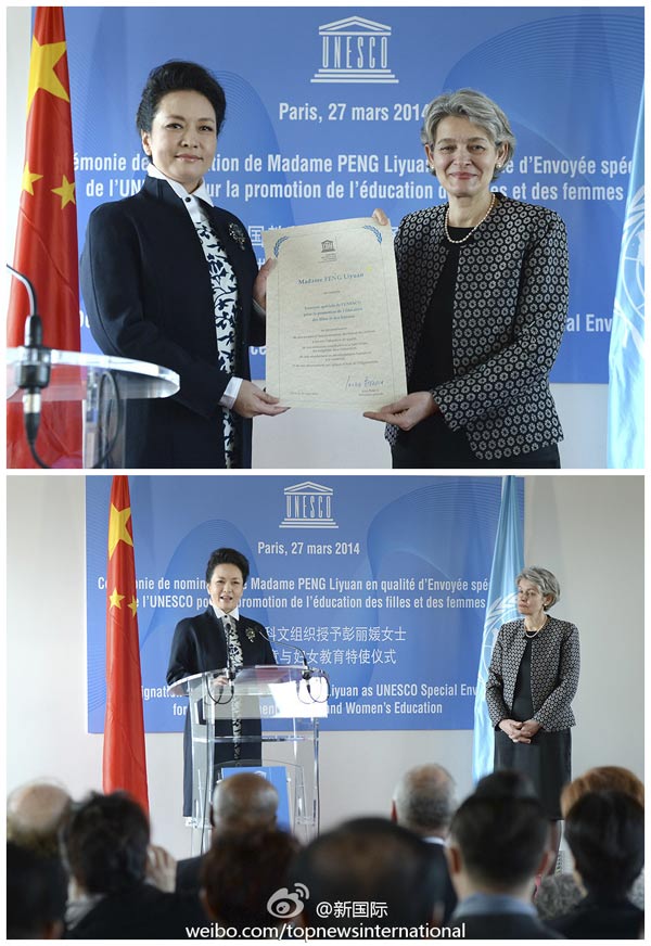 ????新華網北京3月27日電 據新華社“新國際”微博報道,習近平主席夫人彭麗媛27日在巴黎聯合國教科文組織總部被授予“促進女童和婦女教育特使”榮譽稱號。從博科娃總干事手中接過證書后,彭麗媛說,這是一項崇高的事業,我愿意盡我所能,幫助更多孩子,為更多姐妹爭取接受教育的權利。