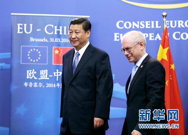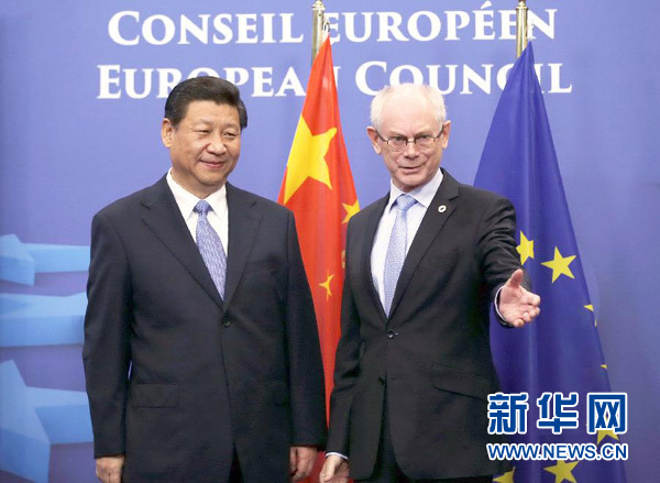 ????新華網(wǎng)布魯塞爾3月31日電(記者 魏建華 錢彤)國家主席習(xí)近平31日在布魯塞爾同歐洲理事會主席范龍佩舉行會談。雙方就新形勢下深化中歐全面戰(zhàn)略伙伴關(guān)系廣泛深入交換意見,達成重要共識。習(xí)近平強調(diào),要從戰(zhàn)略高度看待中歐關(guān)系,將中歐兩大力量、兩大市場、兩大文明結(jié)合起來,共同打造中歐和平、增長、改革、文明四大伙伴關(guān)系,為中歐合作注入新動力,為世界發(fā)展繁榮作出更大貢獻。