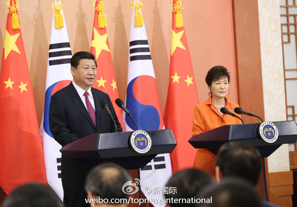 新華網北京7月4日電據新華社“新國際”微博報道,習近平主席3日在同韓國總統樸槿惠會談后共見記者時說,我和樸槿惠總統都認為,中韓兩國應一道努力,成為實現共同發展的伙伴、致力地區和平的伙伴、攜手振興亞洲的伙伴、促進世界繁榮的伙伴。