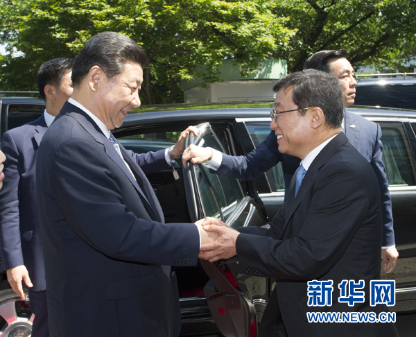 ????7月4日,國家主席習近平在韓國國立首爾大學發表題為《共創中韓合作未來 同襄亞洲振興繁榮》的重要演講。這是首爾大學校長吳然天迎接習近平主席。新華社記者 謝環馳 攝