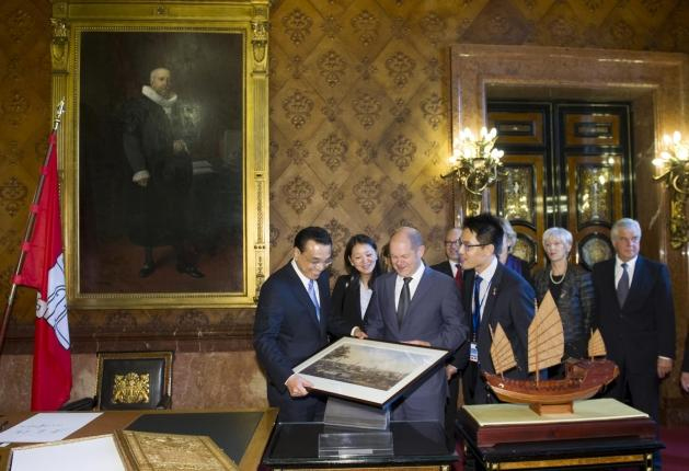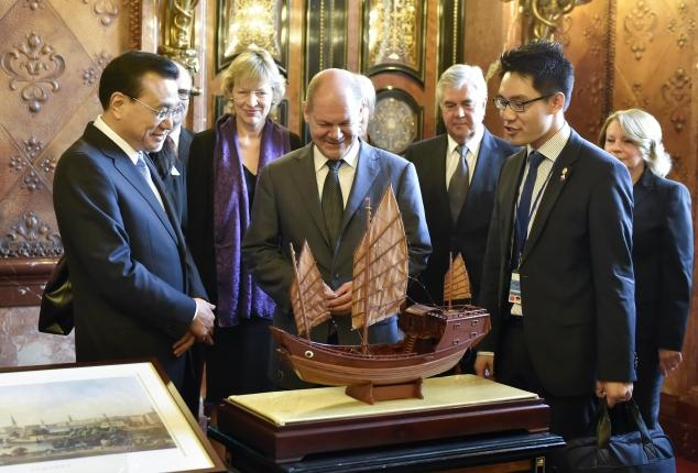 漢堡市政廳里,克強總理將一艘明代商船的復(fù)制模型,贈給漢堡市市長肖爾茨。