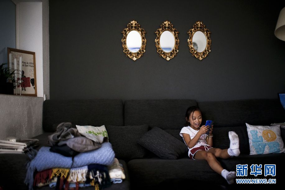????Jana坐在家里的沙發上玩養母Thais的智能手機。新華社巴塞羅那分社攝影師Pau Barrena 攝