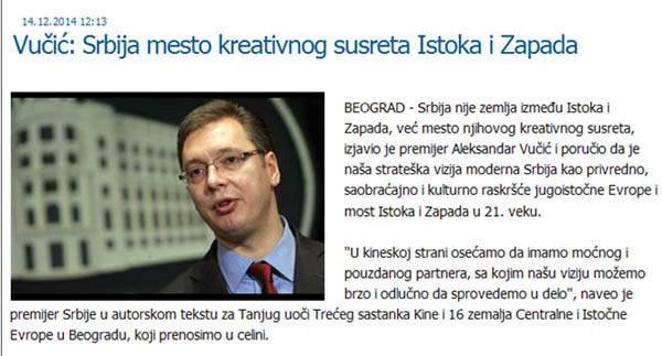 塞爾維亞總理武契奇14日在塞爾維亞南通社發表題為《塞爾維亞是東西方創造性相遇的地方》的署名文章。文章稱,塞爾維亞不是夾在東西方之間的國家,而是東西方創造性相遇的地方。他表示,一個現代化的塞爾維亞(應)成為東部歐洲經濟、交通、文化的交叉點以及21世紀東西方的橋梁。他說,中國是強大的和值得信賴的伙伴,通過同中國的合作,塞爾維亞可以很快、堅定地去實施自己的戰略預想。武契奇還引用《孫子兵法》作者孫武的話“如果你善于利用機會,機會會增加”,表示賽爾維亞將緊緊抓住現在的機遇,為自己的發展創造新的機會。