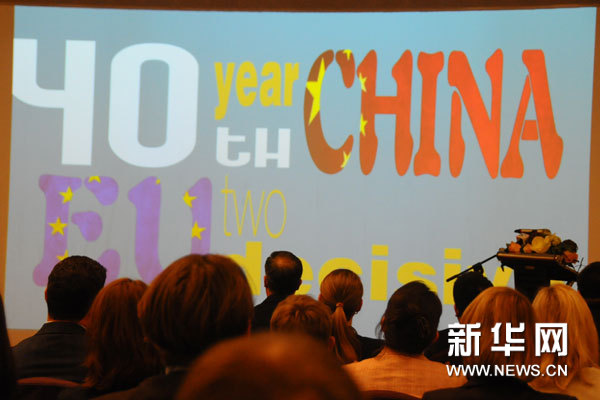??? 7月16日,第十屆歐洲外交官研討班開班儀式暨《中國歐盟建交40周年》紀念畫冊發行儀式在京舉行,圖為學員們觀看中國歐盟四十周年紀念短片。新華網記者 張藝 攝