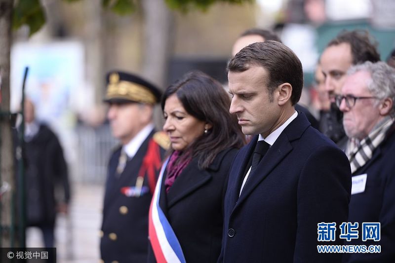 當地時間2017年11月13日,法國巴黎,法國恐襲2周年,法國舉行紀念儀式紀念遇難者。法國總統馬克龍偕夫人布麗吉特及前總統奧朗德等人出席紀念儀式。(圖片來源:視覺中國)