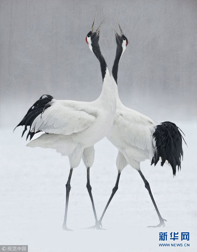 12月25日訊(具體拍攝時(shí)間不詳),日本北海道,一對(duì)丹頂鶴在冰面上翩翩起舞,動(dòng)作驚人一致。(圖片來(lái)源:視覺(jué)中國(guó))