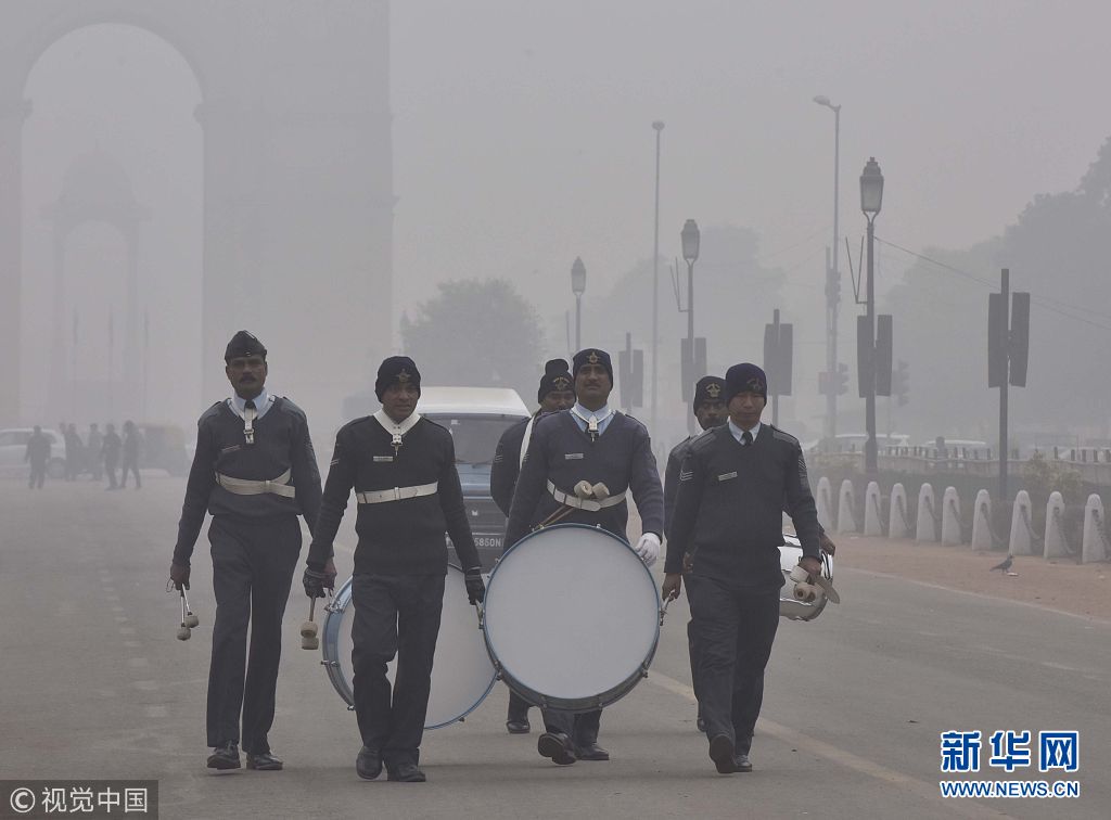 印度新德里遭遇強霧霾 士兵排練閱兵遭“霾藏”