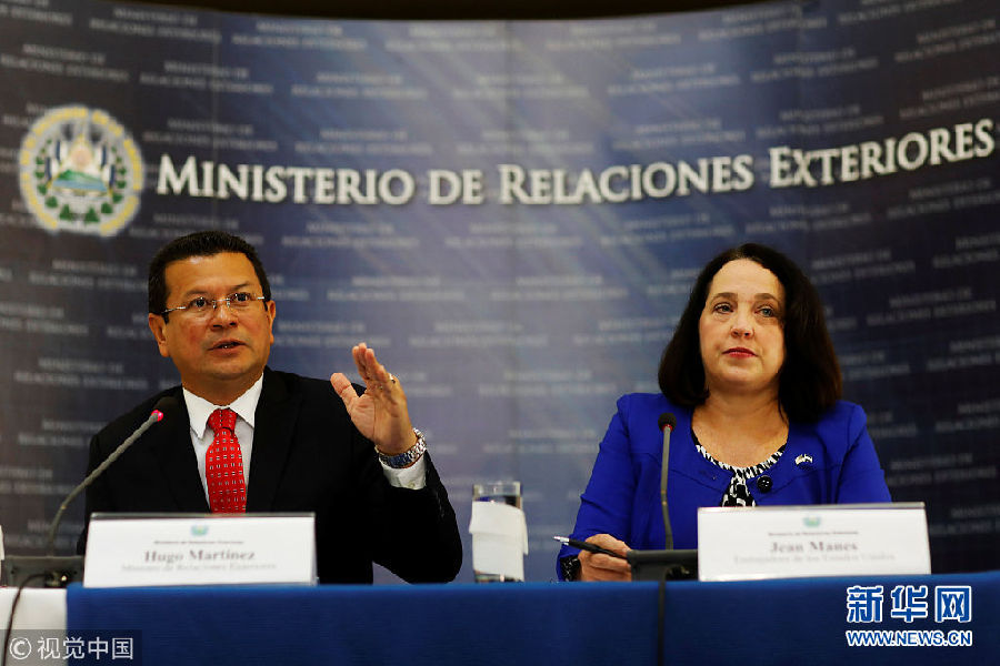 當地時間2018年1月8日,薩爾瓦多圣薩爾瓦多,美國駐薩爾瓦多大使Jean Manes(右)與薩爾瓦多外交部長