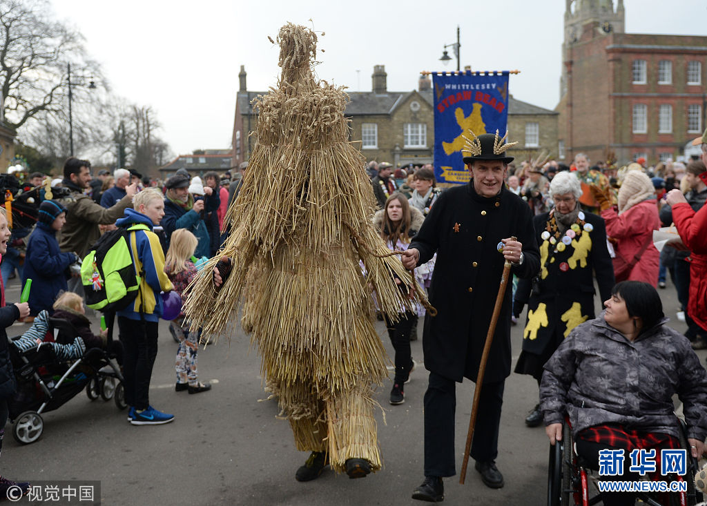當地時間2018年1月13日,英國劍橋郡惠特爾西,民眾打扮成憨厚的“稻草熊”等各種形象,伴隨著樂隊的奏樂游行,慶祝第39屆惠特爾西“稻草熊”節。(圖片來源:視覺中國)