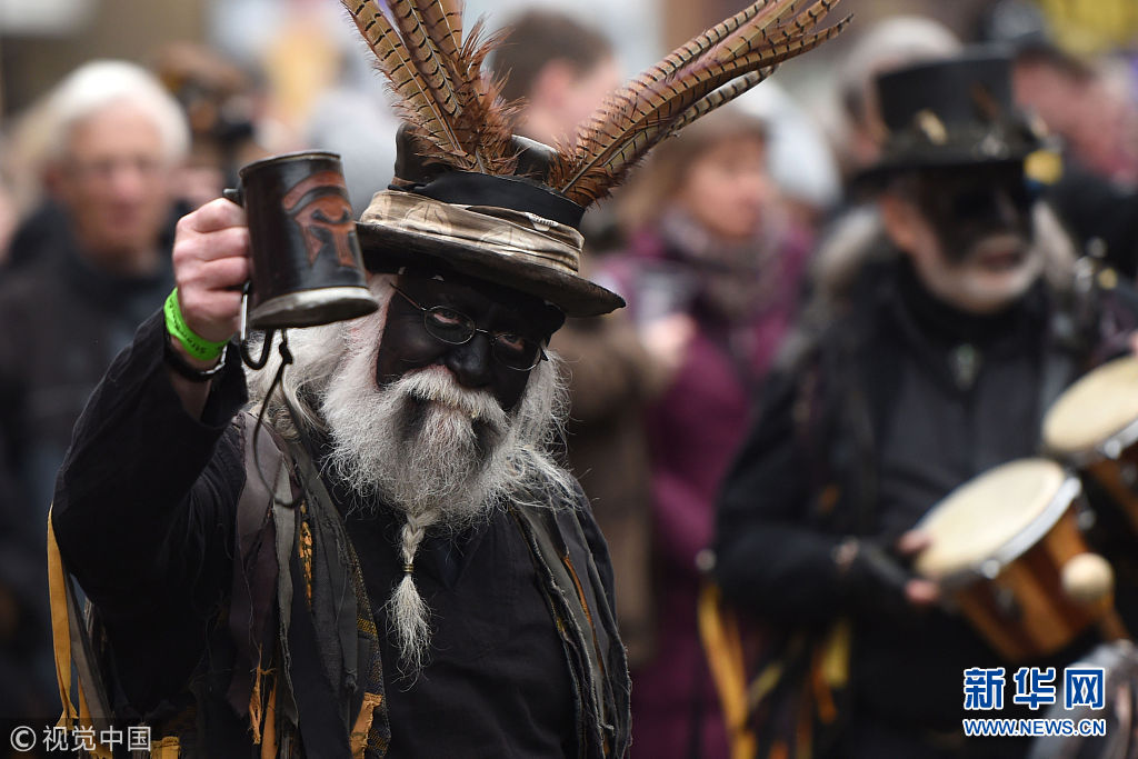 當地時間2018年1月13日,英國劍橋郡惠特爾西,民眾打扮成憨厚的“稻草熊”等各種形象,伴隨著樂隊的奏樂游行,慶祝第39屆惠特爾西“稻草熊”節。(圖片來源:視覺中國)