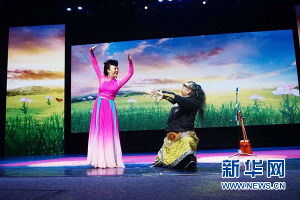 藝術團演員為現場貴賓敬獻哈達。