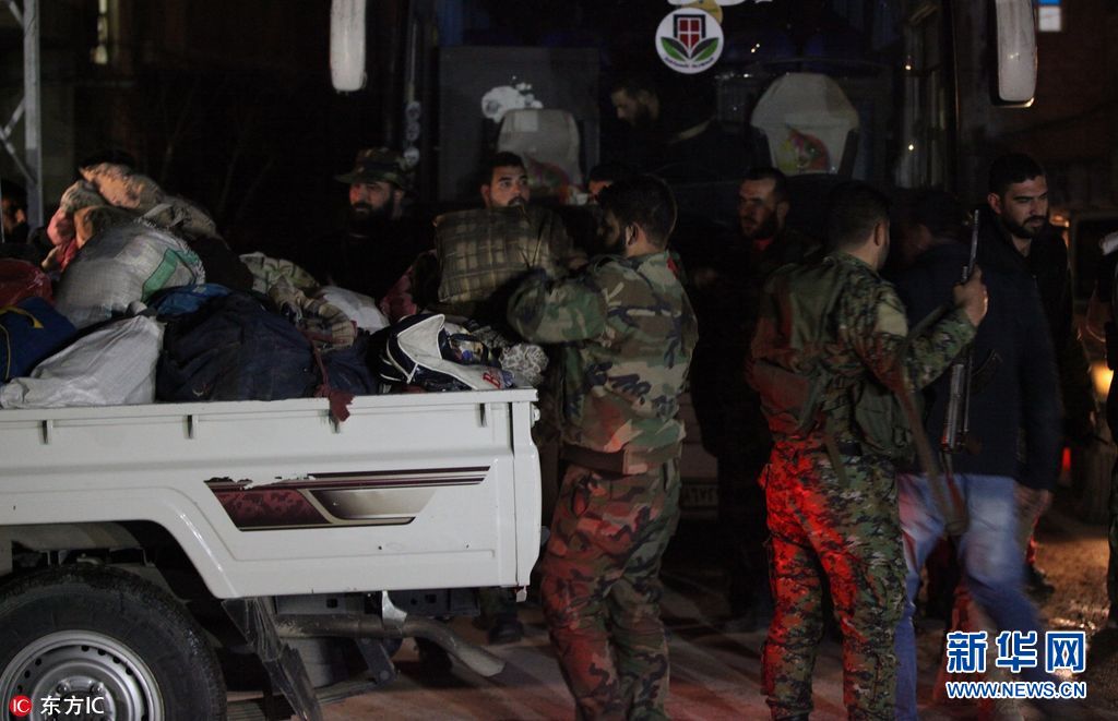 當(dāng)?shù)貢r間2018年3月9日,敘利亞,首批敘利亞反政府武裝人員從東古塔地區(qū)撤離。(圖片來源:東方IC)