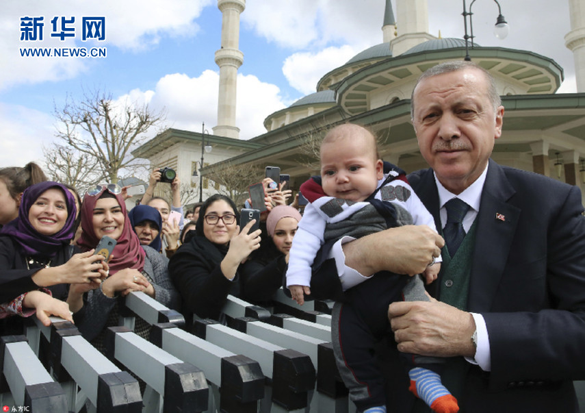 當地時間3月30日,土耳其安卡拉,土耳其總統埃爾多安在星期五禮拜結束后與民眾打招呼。(圖片來源:東方IC)