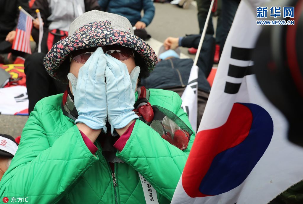 當地時間2018年4月6日,韓國首爾,在首爾中央地方法院前,舉行集會的韓國前總統樸槿惠的支持者得知樸槿惠一審獲刑24年傷心落淚。據報道,首爾中央地方法院對韓國前總統樸槿惠作出一審宣判,判處其有期徒刑24年,罰款180億韓元(約合人民幣1.06億元)。(圖片來源:東方IC)