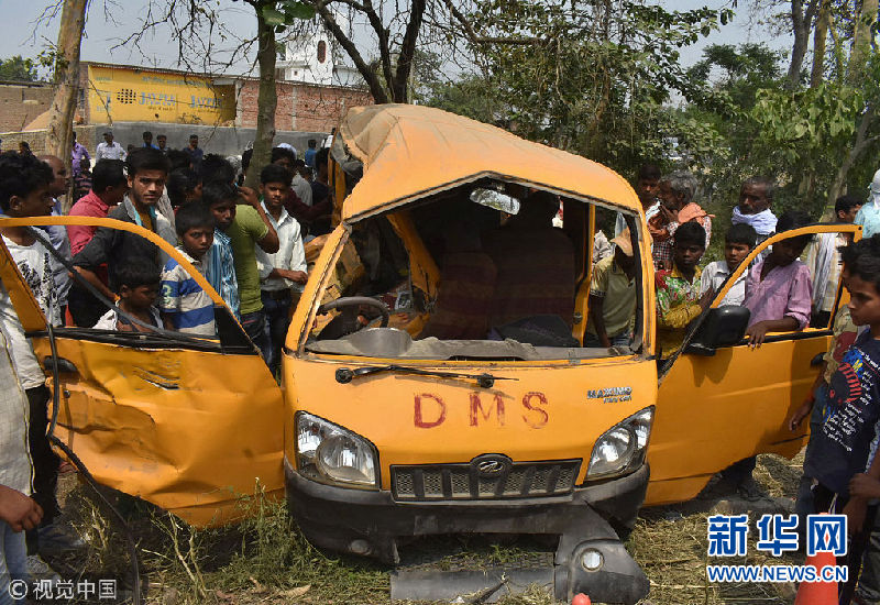 當(dāng)?shù)貢r間2018年4月26日,一輛載有22名兒童的校車在印度北方邦庫新加同一輛火車相撞,事故造成13名兒童死亡,8人傷勢嚴(yán)重。(圖片來源:視覺中國)