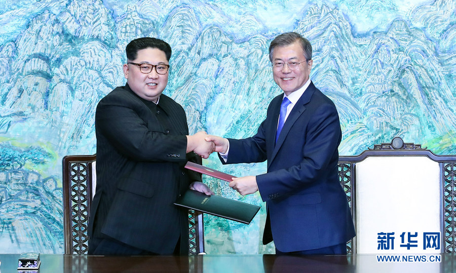 韓國總統文在寅和朝鮮國務委員會委員長金正恩27日在板門店舉行會晤并簽署《板門店宣言》。 新華社發(韓朝首腦會晤媒體報道團供圖)