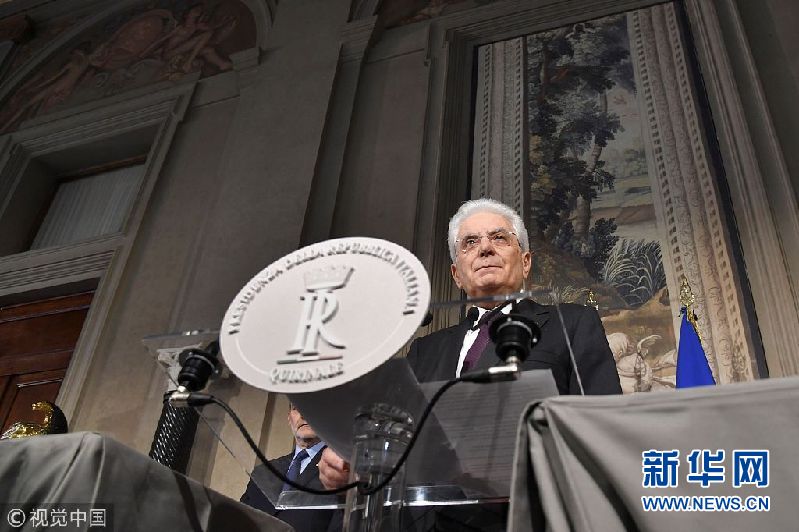 當地時間2018年5月7日,意大利羅馬,意大利總統塞爾焦·馬塔雷拉7日召集新一輪組閣談判并出席新聞發布會。如果所有組閣努力失敗,馬塔雷拉將授權組建技術官僚組成的過渡政府。(圖片來源:視覺中國)