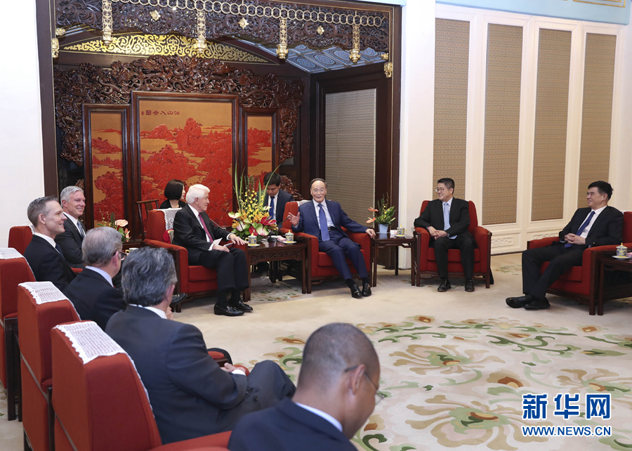 5月15日,國家副主席王岐山在北京中南海會見出席第十輪中美工商領(lǐng)袖和前高官對話的美方代表。 新華社記者 龐興雷 攝