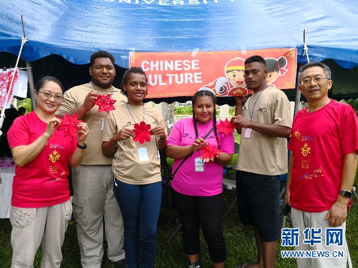 斐濟(jì)中國(guó)文化中心主任鄧先富(右一)與學(xué)習(xí)剪紙的參觀者合影。 新華網(wǎng)記者張永興 攝