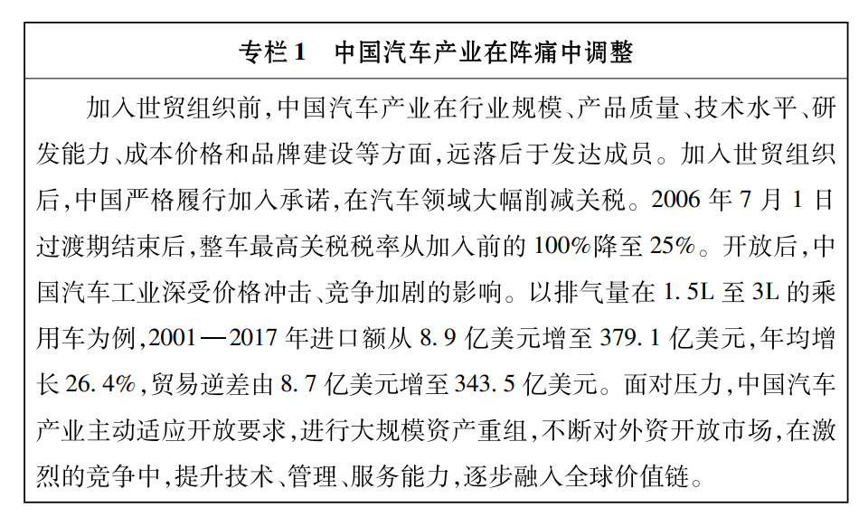 中國在加入世貿(mào)組織時作出廣泛而深入的開放承諾,國內(nèi)企業(yè)直接面對國際競爭,多數(shù)產(chǎn)業(yè)面臨較大困難。中國企業(yè)主動應(yīng)對挑戰(zhàn),大力推進產(chǎn)業(yè)結(jié)構(gòu)調(diào)整,積極參與全球價值鏈,國際競爭力明顯提升。