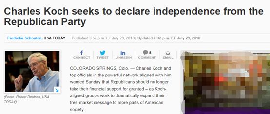 在美國媒體看來,科赫家族的這番最新表態之所以值得關注,是因為他們在今年1月的活動上不僅稱贊了特朗普政府和共和黨給大企業的減稅政策,還表示會繼續投錢幫助共和黨在選戰中戰勝民主黨。
