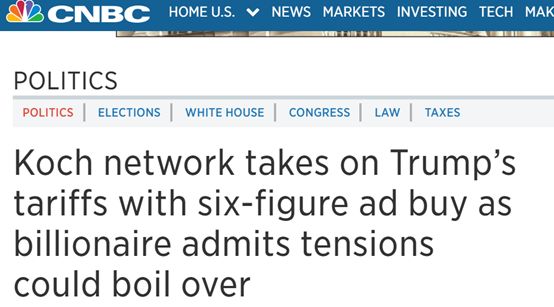 可隨著之后特朗普對中國等國發動貿易戰的行為,以及相關惡果的逐漸顯現,科赫家族的最新表態也與今年1月的言論形成了鮮明的對比。