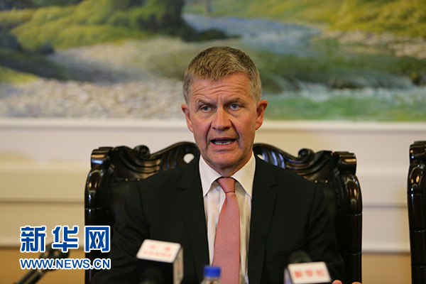 8月24日,在朝鮮平壤,聯合國副秘書長兼環境規劃署執行主任索爾海姆在記者會上發言。新華社記者 程大雨 攝