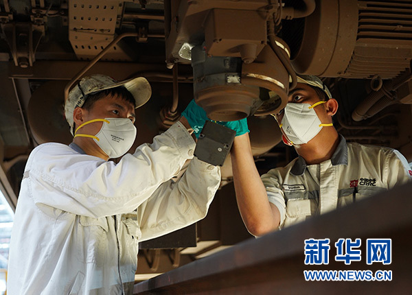 8月27日,在馬來西亞芙蓉市,中車吉隆坡維護保養有限公司的一名中方員工(左)和一名馬來西亞本地員工在維保車間內作業。新華社記者 林昊 攝