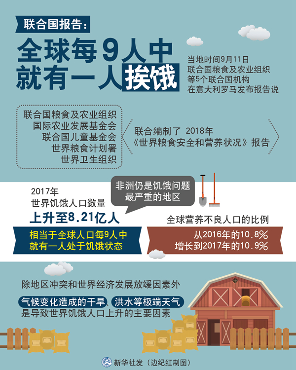 聯合國報告:全球每9人中就有一人挨餓。新華社發 邊紀紅 制圖