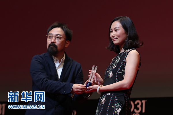 11月2日,在第31屆東京國際電影節頒獎典禮上,中國導演王麗娜(右)在作品《第一次的離別》獲“亞洲未來”單元最佳影片獎后上臺領獎。 新華社記者 杜瀟逸 攝