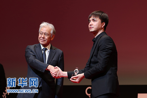 11月2日,在第31屆東京國際電影節頒獎典禮上,中國導演黃璜(右)在作品《武林孤兒》獲“亞洲未來”單元國際交流基金亞洲中心特別獎后上臺領獎。新華社記者 杜瀟逸 攝