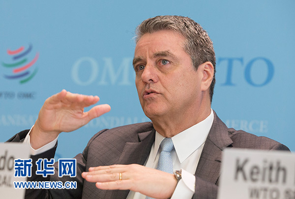 4月2日,在瑞士日內瓦,世貿組織總干事阿澤維多出席記者會。 新華社記者 徐金泉 攝