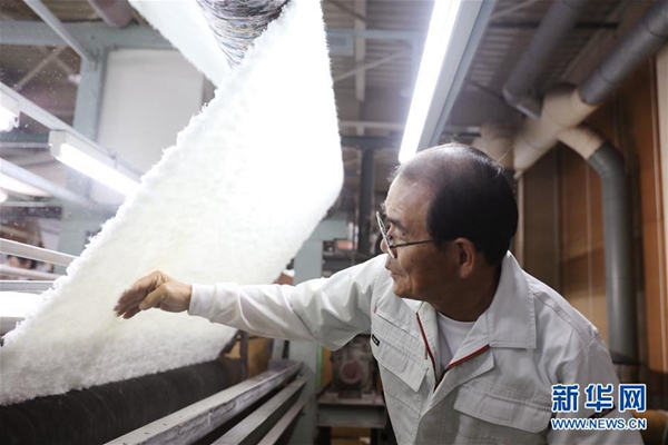 這是5月17日在日本和歌山縣,與岡田織物合作的一間工廠負責人查看制作中的人造毛皮材料。新華社記者 杜瀟逸 攝