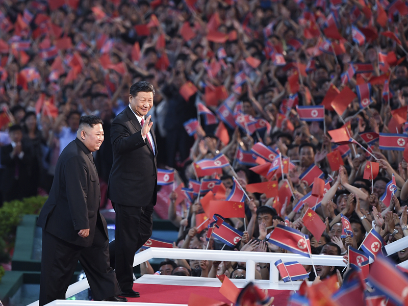 演出在以“朝中友誼萬古長青”為主題的大型歌舞表演中結束。習近平和金正恩同全場觀眾一起站立,為藝術家和演員們的精湛表演送上經久不息的掌聲。