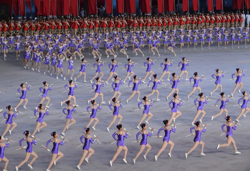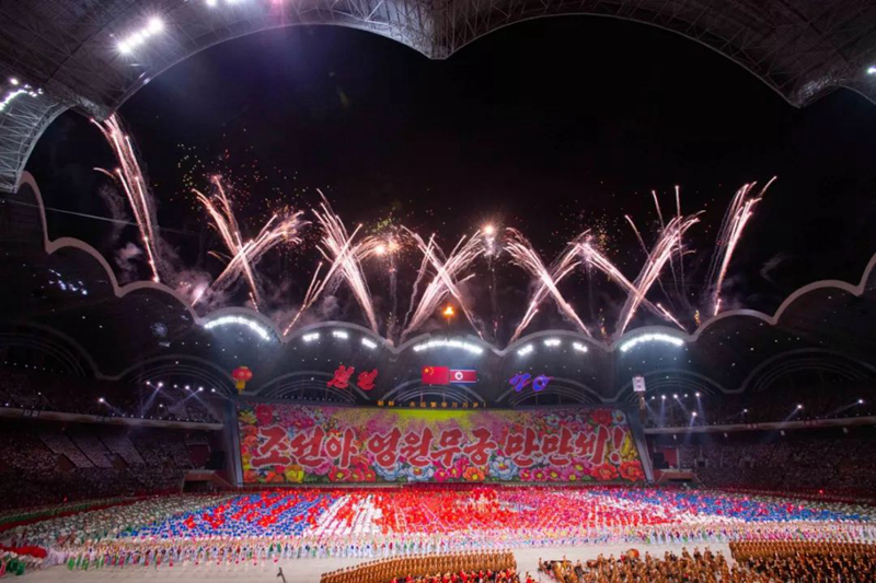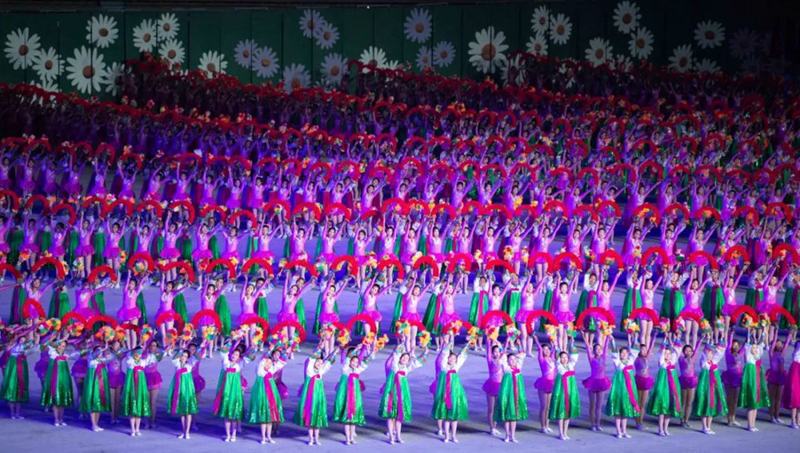 平壤大同江畔,綾羅島“五一”體育場是團體操的主要舞臺。演出以朝鮮民族獨特的“歌舞之美”、富有活力的團體操、嘆為觀止的雜技表演,展現出朝鮮革命與戰爭、政治和軍隊建設、民生與經濟發展以及對外交往的宏偉畫卷。