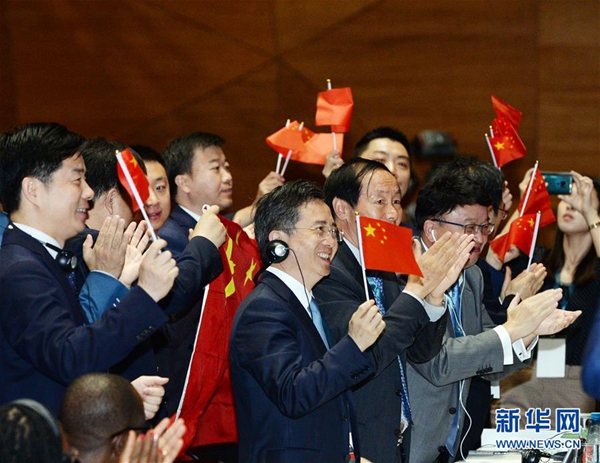 7月6日,在阿塞拜疆巴庫,中國代表團在世界遺產(chǎn)大會上慶祝中國良渚古城遺址申遺成功。中國良渚古城遺址6日在阿塞拜疆巴庫舉行的世界遺產(chǎn)大會上獲準(zhǔn)列入世界遺產(chǎn)名錄。至此,中國世界遺產(chǎn)總數(shù)已達55處,位居世界第一。新華社發(fā)(巴巴耶夫 攝)