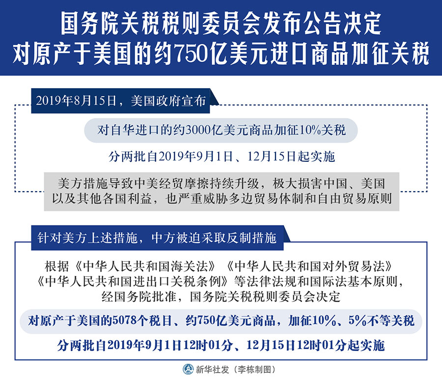 針對美方上述措施,中方被迫采取反制措施。根據(jù)《中華人民共和國海關法》《中華人民共和國對外貿易法》《中華人民共和國進出口關稅條例》等法律法規(guī)和國際法基本原則,經國務院批準,國務院關稅稅則委員會決定,對原產于美國的5078個稅目、約750億美元商品,加征10%、5%不等關稅,分兩批自2019年9月1日12時01分、12月15日12時01分起實施。