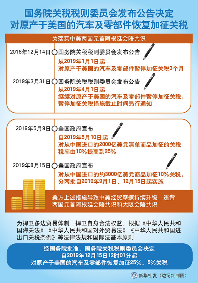 為捍衛多邊貿易體制,捍衛自身合法權益,根據《中華人民共和國海關法》《中華人民共和國對外貿易法》《中華人民共和國進出口關稅條例》等法律法規和國際法基本原則,經國務院批準,國務院關稅稅則委員會決定,自2019年12月15日12時01分起,對原產于美國的汽車及零部件恢復加征25%、5%關稅。