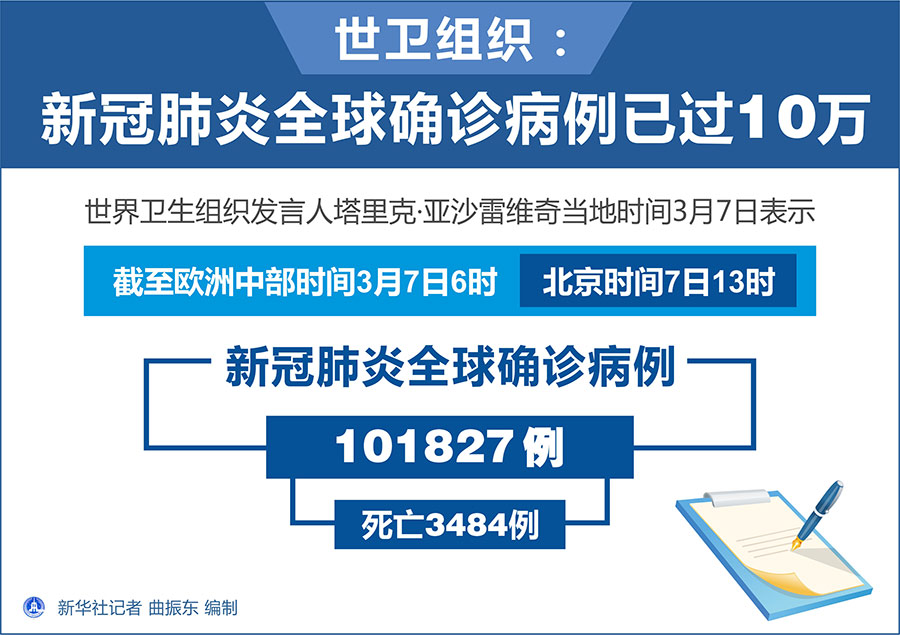 世衛組織:新冠肺炎全球確診病例已過10萬-新華網