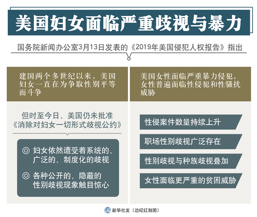 新華社北京3月13日電(記者王鵬、張云龍)國務(wù)院新聞辦13日發(fā)表的《2019年美國侵犯人權(quán)報告》指出,美國婦女面臨嚴(yán)重歧視與暴力。
