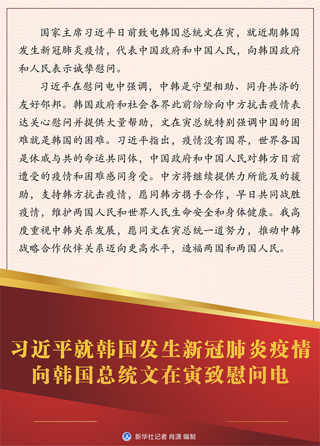 習近平在慰問電中強調,中韓是守望相助、同舟共濟的友好鄰邦。韓國政府和社會各界此前紛紛向中方抗擊疫情表達關心慰問并提供大量幫助,文在寅總統特別強調中國的困難就是韓國的困難。習近平指出,疫情沒有國界,世界各國是休戚與共的命運共同體,中國政府和中國人民對韓方目前遭受的疫情和困難感同身受。中方將繼續提供力所能及的援助,支持韓方抗擊疫情,愿同韓方攜手合作,早日共同戰勝疫情,維護兩國人民和世界人民生命安全和身體健康。我高度重視中韓關系發展,愿同文在寅總統一道努力,推動中韓戰略合作伙伴關系邁向更高水平,造福兩國和兩國人民。