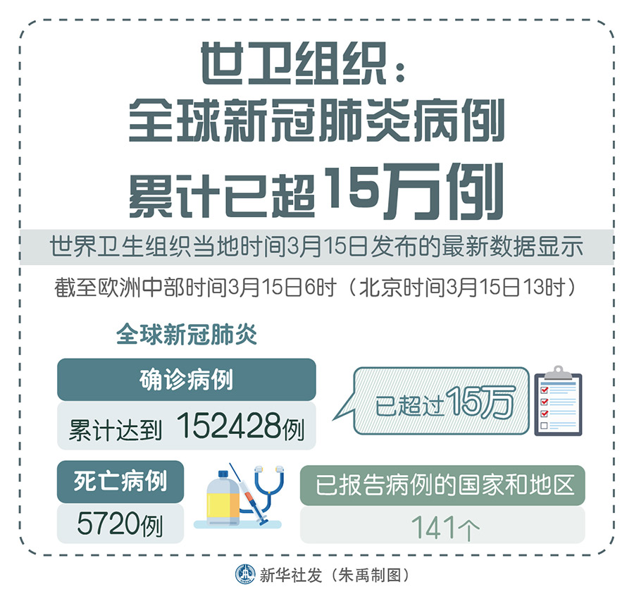 數據顯示,截至歐洲中部時間15日6時(北京時間15日13時),全球新冠肺炎確診病例累計達到152428例,死亡病例5720例,已報告病例的國家和地區達141個。