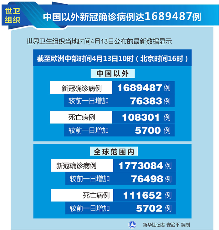 新華社日內(nèi)瓦4月13日電(記者劉曲)世界衛(wèi)生組織13日公布的最新數(shù)據(jù)顯示,中國以外新冠確診病例達(dá)到1689487例。