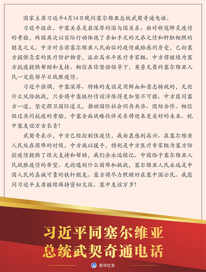 習(xí)近平指出,中塞關(guān)系是最深厚的國與國關(guān)系。面對新冠肺炎疫情的考驗,兩國再次以實際行動體現(xiàn)了親如手足的兄弟之情和肝膽相照的朋友之義。中方對當(dāng)前塞爾維亞人民面臨的疫情威脅感同身受,已向塞方提供急需的醫(yī)療防護(hù)物資,派出高水平醫(yī)療專家組。中方將繼續(xù)為塞方抗疫提供幫助和支持。相信在你堅強領(lǐng)導(dǎo)下,英勇無畏的塞爾維亞人民一定能夠早日戰(zhàn)勝疫情。